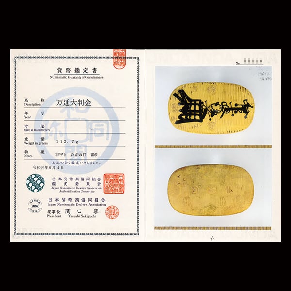 【幻の逸品】万延大判金(たがね打・書改)日本貨幣商協同組合鑑定書付